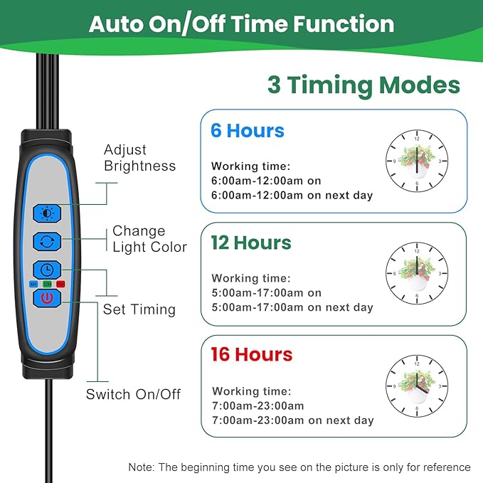 • [6 12 16H Timer]--Most of the plant lights with built-in controllers on the market do not exceed the timed 12H, and ours has been upgraded to exceed 12H, which is more friendly to light-loving plants, so that the plants grow better. Set the timing time(6H 12H 16H), you don’t need to manually turn on and off the grow light. The grow light will convenient to takes good care of your plants when you go out to work or on vacation
