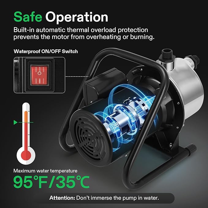 • Safe Operation: This pump features a built-in automatic thermal overload protection to prevent the motor from overheating or burning; The waterproof ON/OFF switch prevents accidental start; Note: As a self-priming pump, the switch must be manually turned off after use