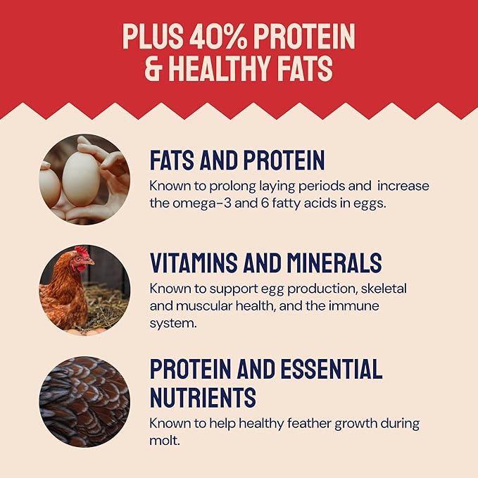 • Powerful Protein & Calcium: These chicken snacks pack more punch than dried worms with 36.4% protein and 4% calcium, making them a top choice for healthy feather growth and egg production. Mix them with other chicken supplies to keep your birds happy