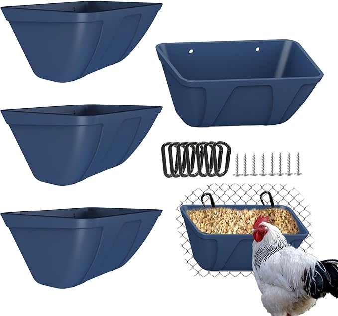• The poultry feeder with sturdy structural design against warpage and easy to be mounted on walls, wire chicken fences with clips or screws; 4 PACK chicken feed trough and each come with 2 clips and screws