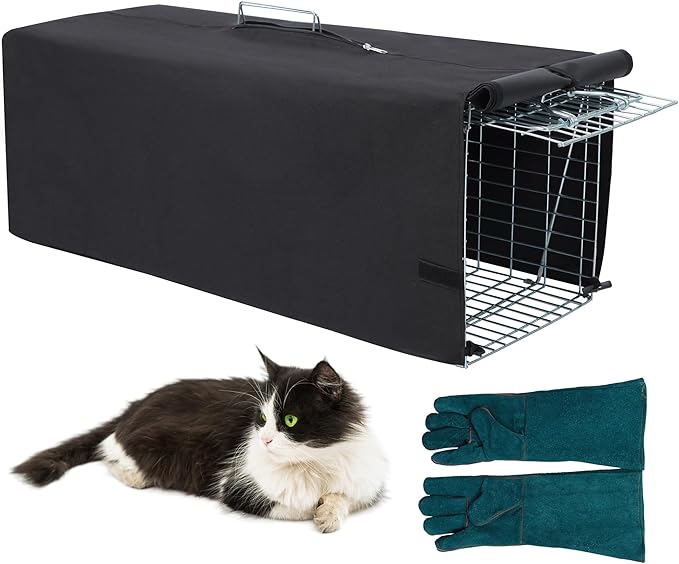 Live Animal Trap Cage with Cover and Gloves, Heavy Duty Folding Animal Traps Cage for Stray Cats, Humane Cat Trap for Raccoon, Squirrel, Skunk, Catch and Release - (32 x 10 x 12 inches)