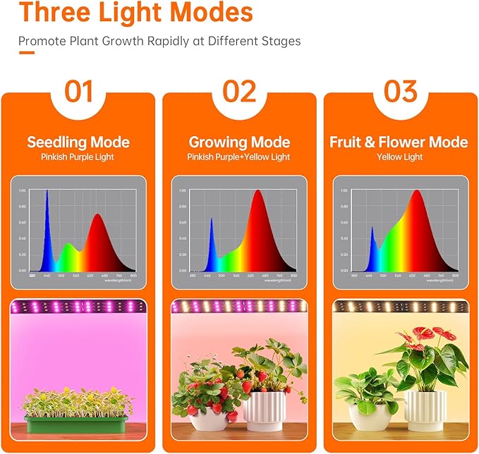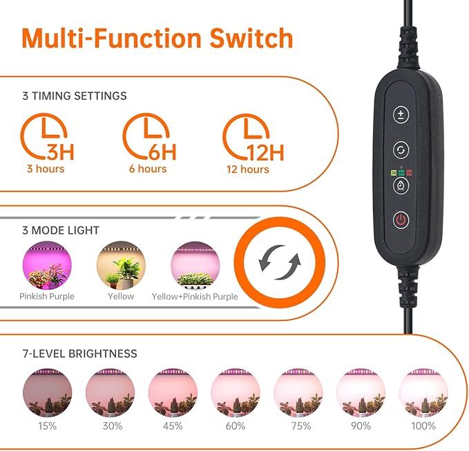 • 【Multi-function Switch】Provides optimal light conditions for every growth stage with its three lighting modes (Pink Purple/Yellow/Mix Light) - Seedling, Growing, and Blooming. Offers seven-level dimming, enabling the brightness to be adjusted from 15% to 100%. 3/6/12 timer mode, travel or work without worrying about plant growth, and fully automatic timer mode to take care of plant growth all year round
