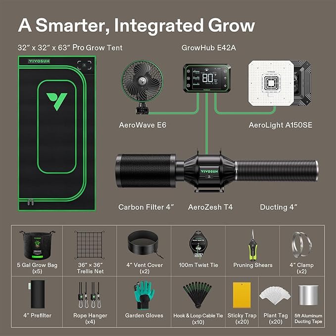 • Complete Plus Kit Included: 32"x32"x63" PRO Grow Tent; AeroLight A150SE 150W LED Grow Light; AeroZesh T4 4" Duct Fan; AeroWave E6 Clip Fan; GrowHub E42A Controller; 4" Carbon Filter; 4" Prefilter; 4" 8ft Ducting; 4" Clamp×2; 36”×36” Trellis Net; 5 Gal Grow Bag×5; 4" Vent Cover×2; Pruning Shears; 100m Twist Tie; Sticky Trap×20; Plant Tag×20; Hook & Loop Cable Tie×10; 5ft Aluminum Ducting Tape; Garden Gloves; Rope Hanger×4