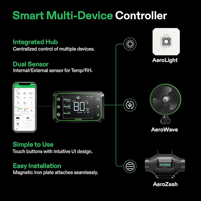• Smart Grow with GrowHub E42A: With a built-in temp and humidity gauge and one probe, the GrowHub E42A Controller monitors changes in both the internal and external environment including VPD; WiFi connectivity and app control allow you to access real-time data and remotely manage equipment from anywhere