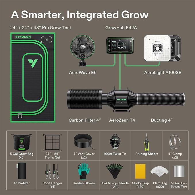 • Complete Plus Kit Included: 24"x24"x48" PRO Grow Tent; AeroLight A100SE 100W LED Grow Light; AeroZesh T4 4" Duct Fan; AeroWave E6 Clip Fan; GrowHub E42A Controller; 4" Carbon Filter; 4" Prefilter; 4" 8ft Ducting; 4" Clamp×2; 24”×24” Trellis Net; 5 Gal Grow Bag×5; 4" Vent Cover×2; Pruning Shears; 100m Twist Tie; Sticky Trap×20; Plant Tag×20; Hook & Loop Cable Tie×10; 5ft Aluminum Ducting Tape; Garden Gloves; Rope Hanger×4