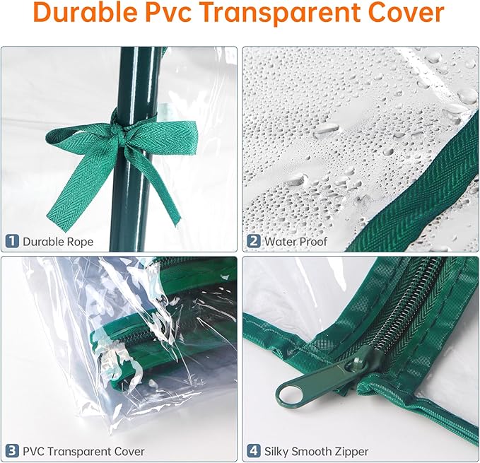 • 【Sturdy Pole with PVC Cover】The sturdy frame is constructed from rigid steel tubing, ensuring long-lasting durability, no tools are required during assembly. You can observe the growth status of seeds/plants at any time without opening the zippered door, while also being cold-resistant and waterproof