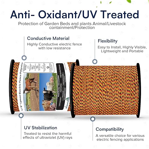 • LIGHTWEIGHT HEAVY-DUTY AND HIGH QUALITY: UV treated made with superior BASF stitched materials. This polywire electric fencing is Made to last for Many years with easy installation with a 216LB Load breaking capacity and it your best choice for electric fencing