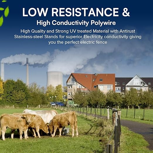 • LOW RESISTANCE AND HIGH CONDUCTIVITY POLYWIRE: My Animal Command’s Polywire consists of 9 inter-woven and highly conductive stainless-steel strands with a low 4.8Ω ohms/meter resistance only. High Quality electric fence for livestock and Strong UV treated Material with Antirust Stainless-steel Stands for superior Electricity conductivity giving you the perfect portable electric fence