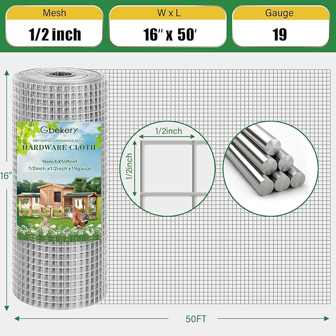 • [Heavy Duty Material]: Gbekery Hardware cloth is crafted from high-quality, robust materials. And The size of the chicken wire is 16 inch×50 ft and 1/2 inch×1/2 inch thickness.
