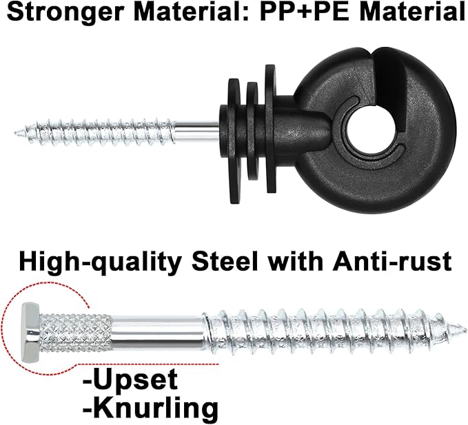 • 🚧【Package List & BESTEEL Lifetime Service Guarantee】This kit includes: 100 Pack Black Electric Fence Screw-in Ring Insulators + 1 Pack Insulator Socket Tool + 660 Feet (200 meters) Poly Wire Combo Roll Pack. Customer satisfaction is our first priority. BESTEEL products are all offered 3 Years Warranty or Replacement and Lifetime Customer Service. If you have any questions, feel free to contact us and we will reach you at the soonest to offer a satisfactory solution.