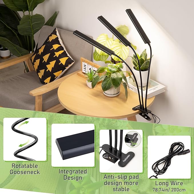 • Flexible Gooseneck & Sturdy clip: The FOXGARDEN plant light is designed with a versatile gooseneck and a sturdy clamp featuring anti-slip properties, ensuring effortless installation on any deskor plant stand. This setup allows you to position the grow light in any direction, enabling optimal lighting angles for comprehensive coverage around your plants. Additionally, the design is plant-friendly, with no extra components that could potentially harm your plants.