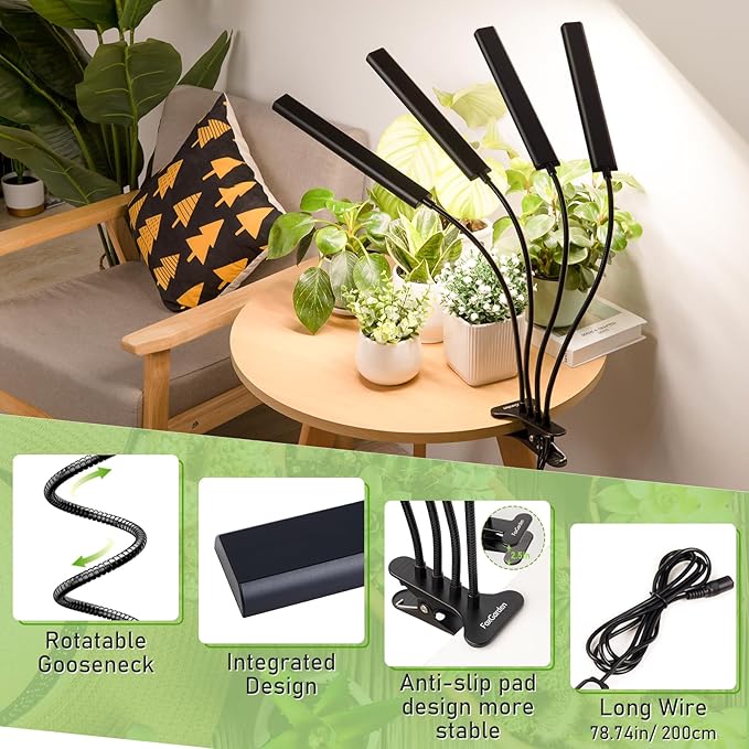 • Flexible Gooseneck & Sturdy clip: The FOXGARDEN plant light is designed with a versatile gooseneck and a sturdy clamp featuring anti-slip properties, ensuring effortless installation on any deskor plant stand. This setup allows you to position the grow light in any direction, enabling optimal lighting angles for comprehensive coverage around your plants. Additionally, the design is plant-friendly, with no extra components that could potentially harm your plants.