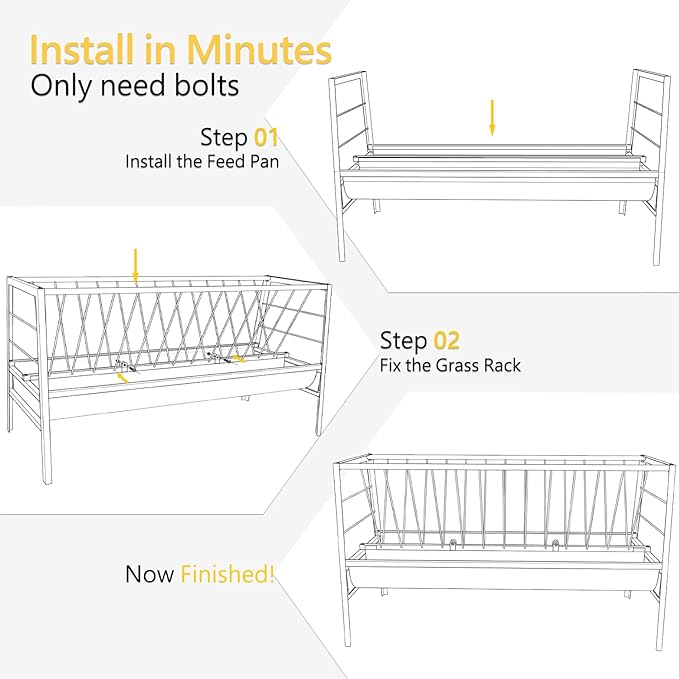 • Quick to Assemble: Getting the pasture feeder done only needs some screws. You will finish the assembly in 10 minutes, saving your time and labor. The lightweight structure allows an effortless carrying.