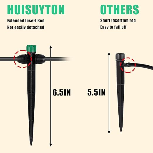 • Quick Connect Design: Upgrade drip irrigation emitter can be connected directly to 1/4" irrigation tubing,not easily detached.And it has been designed with an extended length of 6.5 inches.Easy to install without any other tools.Just push the tube firmly onto the barb and tighten the nut. Locks increases the tightness and will not leak.