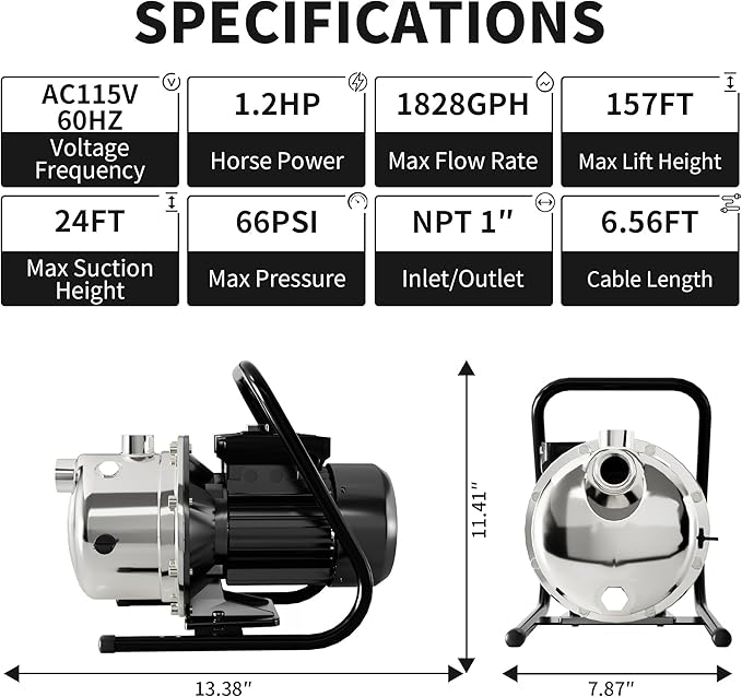 • [POWERFUL PERFORMANCE] The electric water pump with 1.2 HP powerful motor ensures strong performance in a low energy consumption. The well pump can offer maximum flow rate up to 1828 GPH and max lift water up to 157 feet