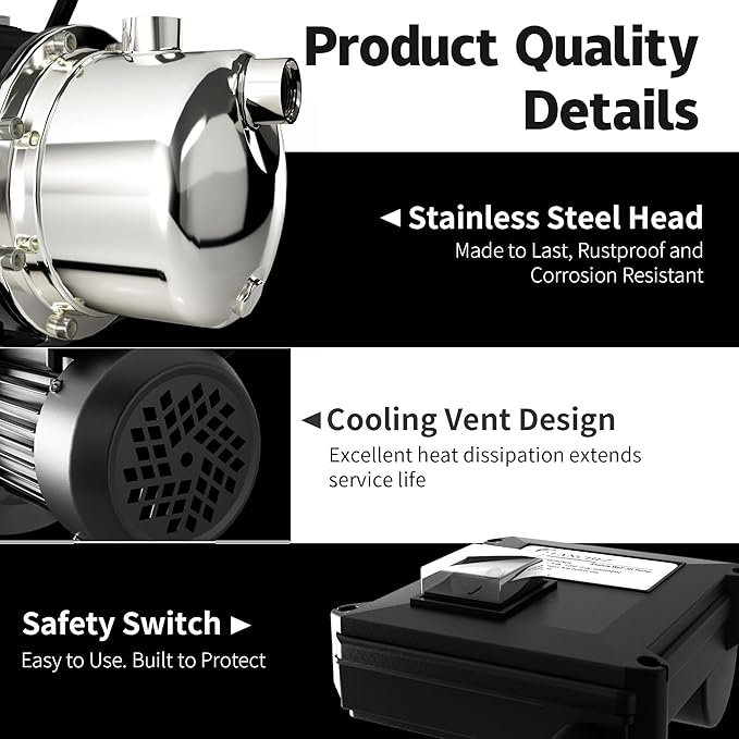 • [PORTABLE & DURABLE] 10ft extended length grounded waterproof power cord with portable handle for easy installation from farther locations. Corrosion-resistant stainless steel of the portable lawn pump head for against corrosition and abrasion extends product life and is easy to clean