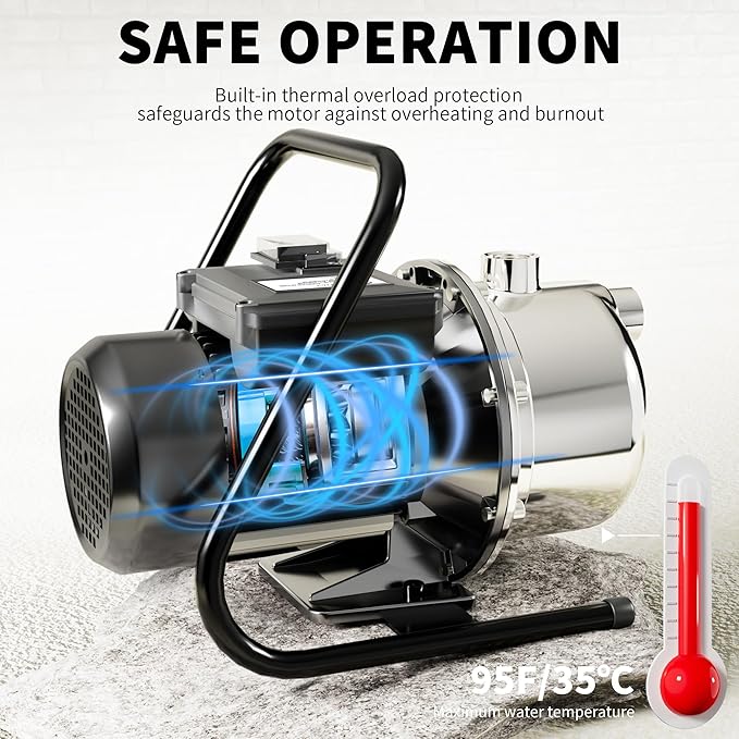 • [SAFETY ENSURE] LANCHEZ shallow well pump pay attention to safety. Built-in thermal overload protection for continuous duty use in water removal application, will prevent the motor from overheating and burning. You can start the water booster pump with the safety switch after plugging it in to the 110V 120V AC power source
