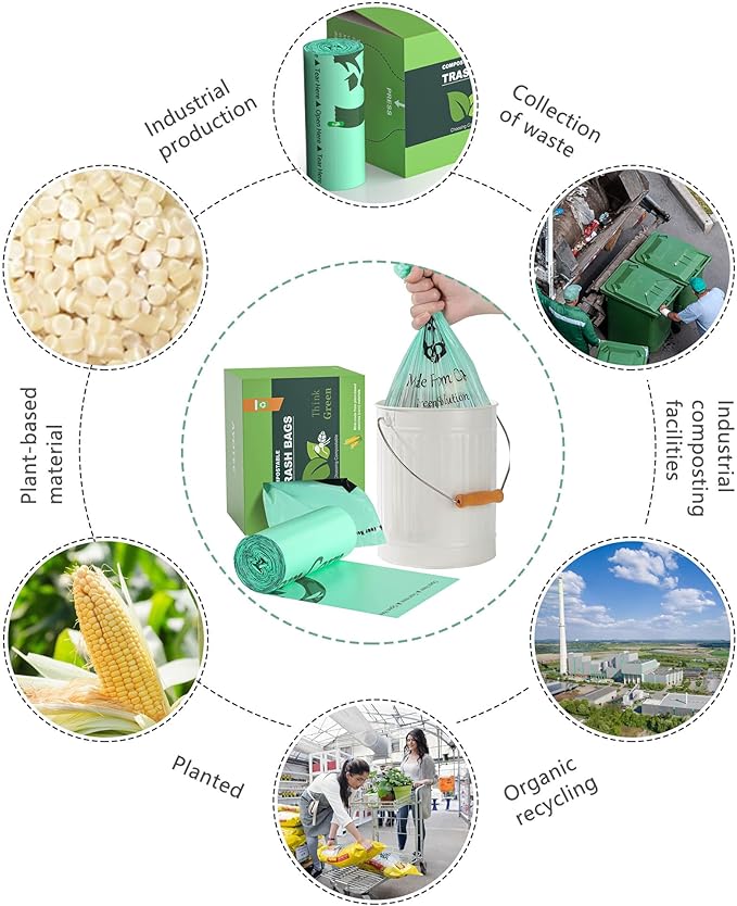• Made from Nature, Returning to Nature: AYOTEE compostable small trash bags 1.2 gallon are made from plant-based materials, primarily corn starch. These compostable garbage bags can quickly degrade in municipal industrial composting facilities (under constant humidity at 50-60°C), ultimately returning to the Earth in the form of water, CO2, and biomass