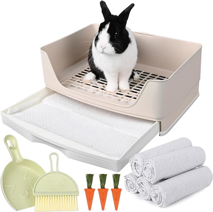 • Package Include: For the same price, you'll get 10pcs in total! 1*Large rabbit litter box. 1*plastic dustpan and broom set, is perfect for sweeping in and around the litter box. 3*random grass cakes, are good for chewing and playing to add more fun to your pet's life. And 5 pcs rabbit cage liners,absorbent liners to make clean up even easier