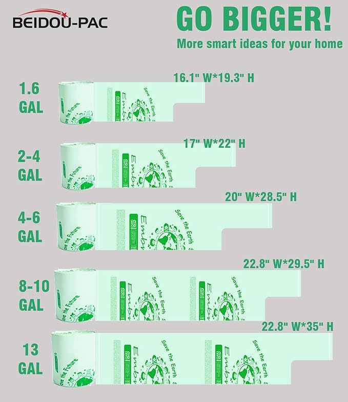 • [SAFE & NO PLASTIC RESIDU] -- BEIDOU-PAC 100% Certified Compostable Kitchen Food Scrap Bags, Kitchen Compost Bin Compatible, are safer for the environment, which are mainly made from Vegetable starch like corn, and completely degrade into biomass, water and CO2. after 1 year when placed in both home and commercial composting facilities. 100% compostable food waste bin bags are made from plant vegetable and 100% return back to earth.