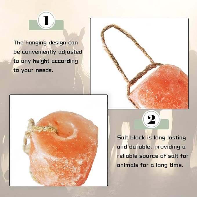 • 【Easy to Install】Deer salt lick block has a long,sturdy rope that not only adjusts to the right height for the size of your animal, but also allows you to easily hang them in your pasture, stall or designated animal area.Salt block for horses can provide entertainment for horses, deer, goats, cows and other domestic animals to relieve their boredom and fulfill their needs.