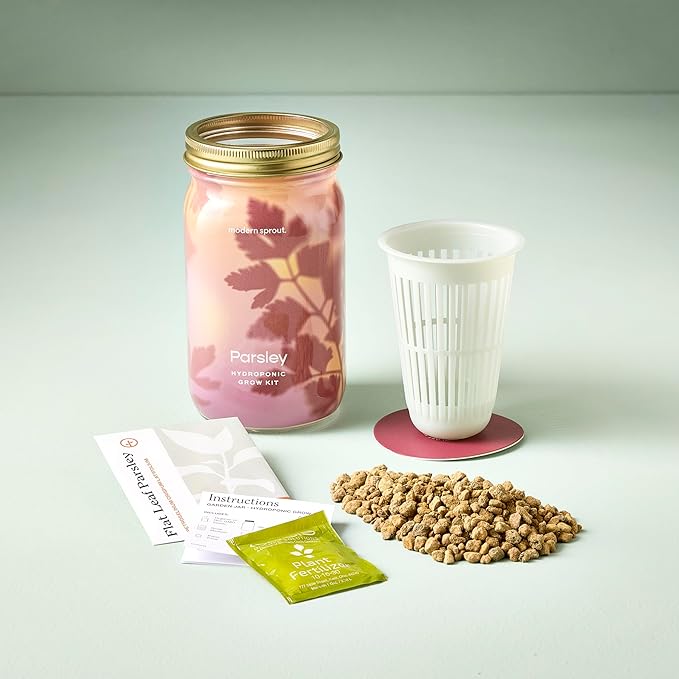 • Package Contents: 1 unit of hydroponic parsley grow kit featuring a mason jar with a removable sleeve made from recyclable materials (6" high by 3.5" wide, weighing 1 lb), organic non-GMO parsley seeds, a 100% recycled HDPE net pot made in the USA, lava rock grow medium sourced domestically, plant food, coaster, and detailed instructions; Designed for reuse and proudly assembled in the USA, it offers a sustainable way to grow fresh herbs indoors