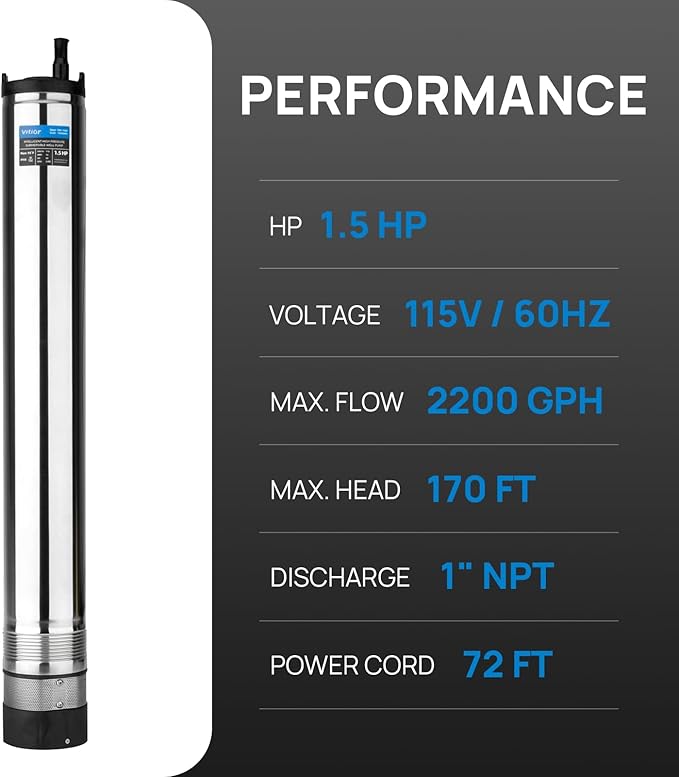 • Two-year warranty:The VITIOR submersible water pump is ideal for a variety of applications, including home water supply, garden use, and farm irrigation. Backed by a 24-month warranty for worry-free use.