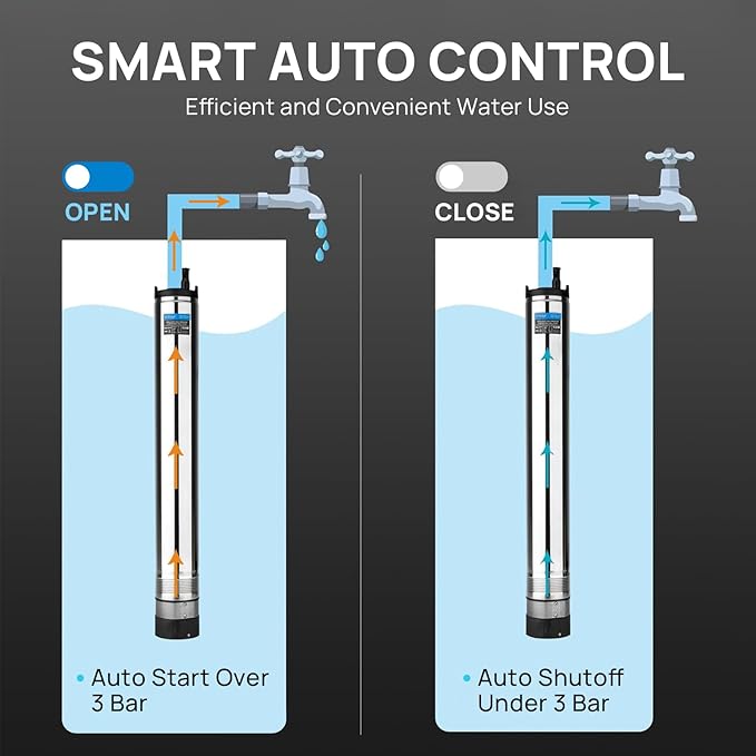• Auto Start/Stop Function:The automatic deep well pump features a built-in pressure sensor that starts the pump when pressure exceeds 3 bar, and stops it when pressure drops below 3 bar or no water is detected. The well pump includes dry-run protection to prevent damage.