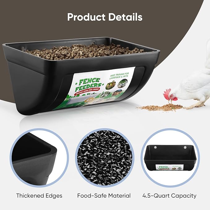 • 🐎【Two Hanging Methods】 Tailor Your Feeding Setup With Ease. Hang Them Securely on Wire Fences Using Hooks or Install Them Firmly With Screws. No Waste & No Mess our Hanging Chicken Feeder Trough Is Specifically Designed for Preventing Animals From Eating off The Ground, and The Convenience Is Guaranteed. Enjoy a Hassle-Free Feeding Experience Tailored to Your Needs