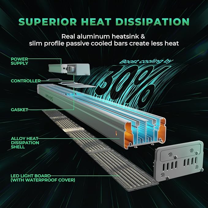 • 【Oustanding Cooling and Waterproofing】 The greenhouse LED lights feature aluminum lampshades and ultra thick heat sinks, providing unparalleled heat dissipation capabilities to prevent plant burning or damage. It use advanced waterproof sealing technology to easily cope with humid environments and unexpected splashes of water, with a lifespan of up to 50000 hours.