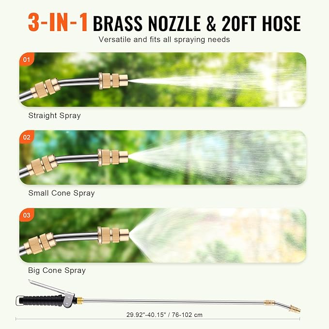 • Handheld Spray Boom & Brass Nozzle: Our telescopic boom offers adjustable spraying distances, while sturdy brass nozzle ensures durability. The reinforced handle offers a comfortable grip, and the 5.6" large tank opening facilitates easy liquid pouring.