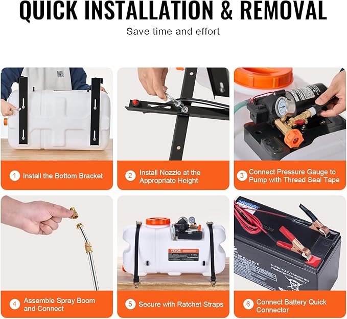 • Strong Spray, Broad Range: The 12V pump delivers high pressure at 116PSI and a flow rate of 1.9GPM, ensuring potent spraying with wide coverage. Adjust the working pressure from 0 to 72PSI with the built-in gauge for precise control. The 8 ft quick coupling line simplifies setup.