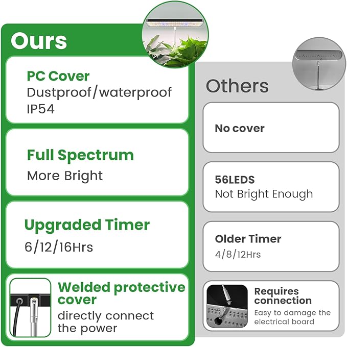 • New Controller: This plant lights are equipped with 5 Levels 20pct to 100pct, 3 lighting spectrum “white, warm white and red and blue, mix light”. In particular, we have upgraded the timer to 6H, 12H, 16H, which allows plants to receive longer light time.