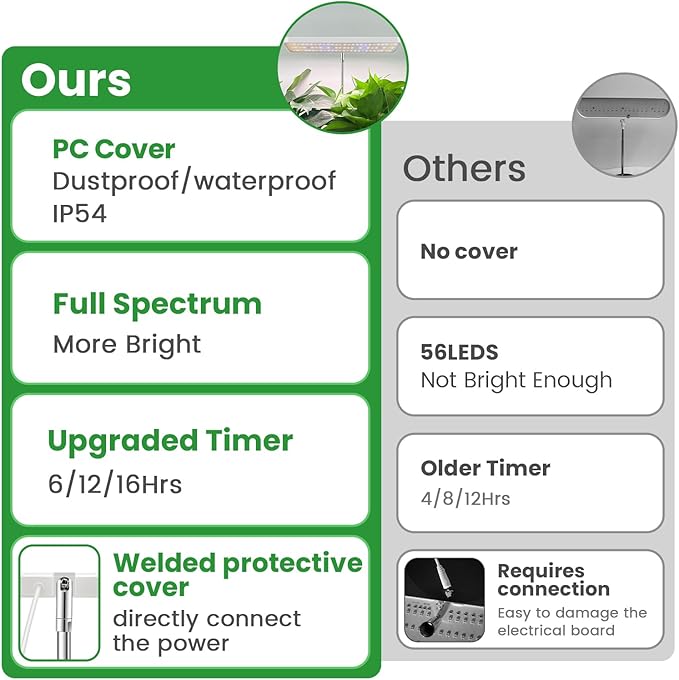 • Upgraded Plant Grow Light: This plant lamp is equipped with PC cover, and a protective sleeve is welded to the lamp board interface. Not only is it waterproof, it also provides safe lighting protection.5.2 in metal base and anti slip pads ensure stability.