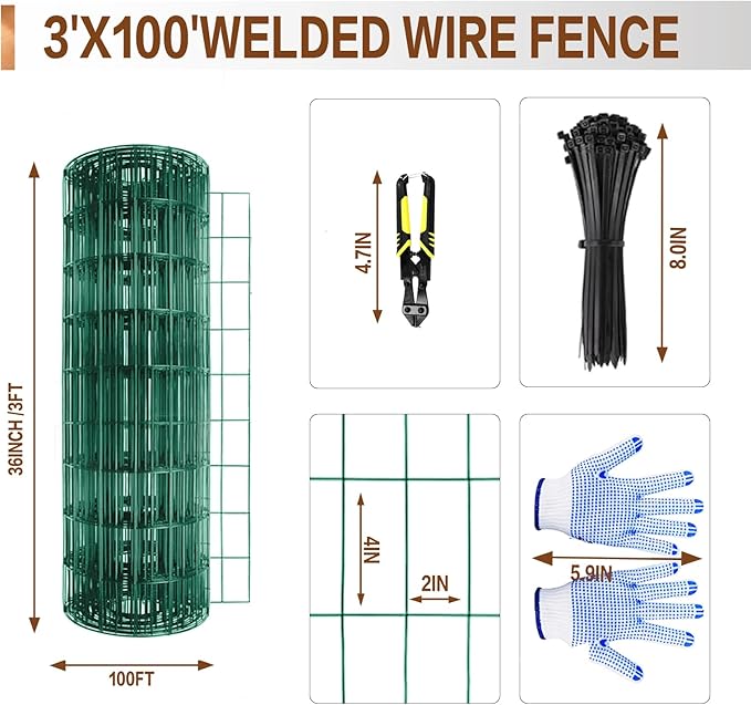 • Welded Wire Mesh Roll: This welded wire fence size is 3 ft x 100 ft and comes in a roll format, allowing you to customize its length according to your specific needs. Whether you need a short section for a small flower bed or a longer stretch to enclose an entire yard, the flexible nature of this welded wire mesh roll ensures a seamless and professional-looking installation.
