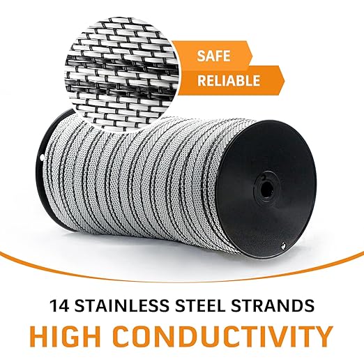• This heavy duty electric fence tape features PVC-coated high-density fiberglass for UV protection, which will not rust and is not easy to break, creating a fence that's built to last. That it will last out on the farm through continuous years using