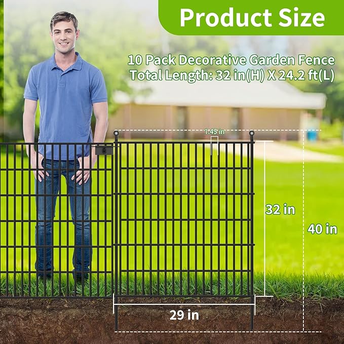 • 【Classic Exterior Design】Each garden fence animal barrier for backyard is 29 inches wide by 32 inches high and comes with 11 metal stakes that can be inserted 8 inches into the ground for sufficient stability. There are a total of 9 fence panels + 1 fence gate with a total length of 24.2 feet to perfectly suit your needs.