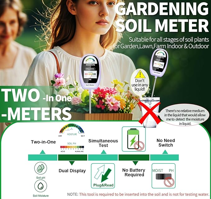 • INTUITIVE INSIGHTS PLANTS: 2-in-1 soil tester includes soil moisture meter and soil pH meter, allows you to effectively and accurately measure critical soil moisture levels and soil pH results. No longer finger-touch the dirt and no worry about overwatering. This soil tester takes the guesswork out of taking care of your plants and elevates your planting experience to the next level.