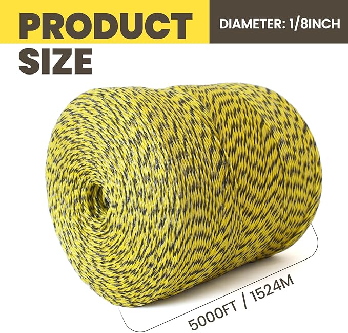 Electric Fence Wire 1/8" 5000 Feet/1524 Meters, Upgraded 6 Stainless Steel Strands Conductors, UV Wear Rust Resistant, Portable Polyrope Electric Fence Polywire for Livestock