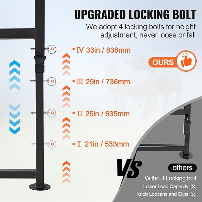 • 2. **Adjustable Goat Stand with 4-Level Height:** Featuring a unique pin design, this adjustable goat stand provides four height settings (21" to 33") to accommodate animals of different sizes. Its reinforced uprights and triangular frame offer stability, making it suitable as a sheep stand for trimming or a livestock stand.