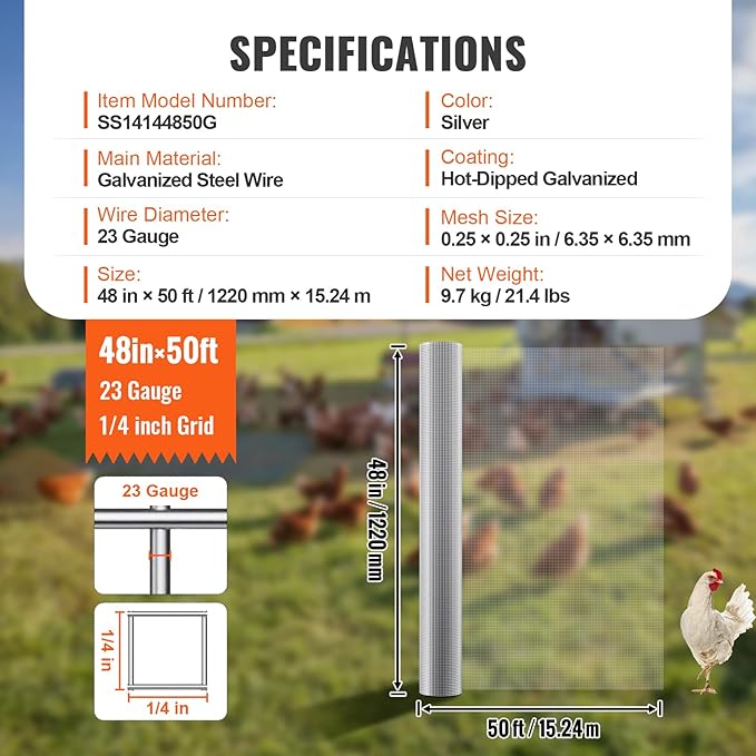 VEVOR Hardware Cloth, 1/4 inch 48in x 50 ft 23 Gauge, Hot Dipped Galvanized Wire Mesh Roll, Chicken Wire Fencing, Wire Mesh for Rabbit Cages, Garden, Small Rodents