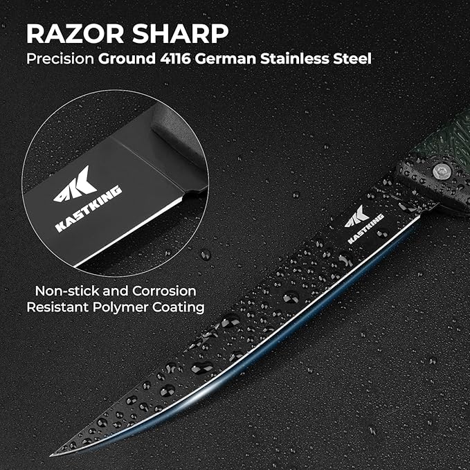 • Corrosion Resistant Finish – The new KastKing Folding Fillet/Camping/Hunting knife has a corrosion resistant, titanium bonded, non-stick finish that slides through fish easily while improving long term corrosion resistance.