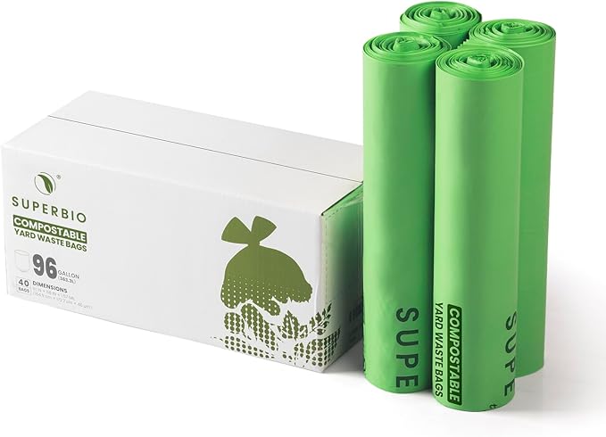 SUPERBIO 96 Gallon Compostable Lawn & Leaf Bags, Extra Thick 1.57 Mil, (40 Count Bulk), Large Yard Waste Bag, ASTM D6400, US BPI and Europe OK compost INDUSTRIAL Certified