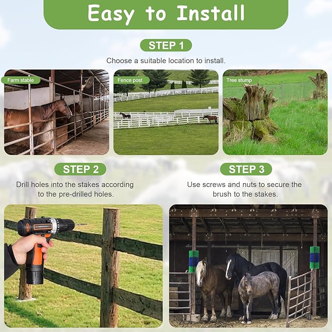 • Easy to install/disassemble, This goat brushes for grooming includes 1 brush and 4 screws. It can be installed in barns, pastures, livestock fences, horse sheds, trees, walls, or anywhere outdoors, and it is also easy to dismantle if you need to demolish it.
