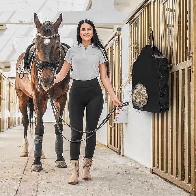 • 【Wide applications】Hay Bag suitable for different scenarios you can hang it indoors,outdoors,on trees,corrals or pastures, It is a feed handbag for horses,donkeys,cows,alpacas,ostriches,or other animals,can help you store hay properly and prevent the hay from getting wet or dirty for use on the go.