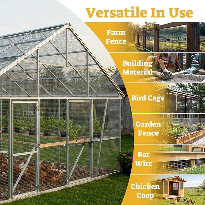 • Versatile & Easy to Customize: The hardware cloth fencing can be easily cut to fit a wide range of projects. Perfect for chicken coop covers, animal enclosures, garden fences, raised garden beds, tree guards, wall decorations, and more. Customize it to meet your specific needs for both indoor and outdoor applications