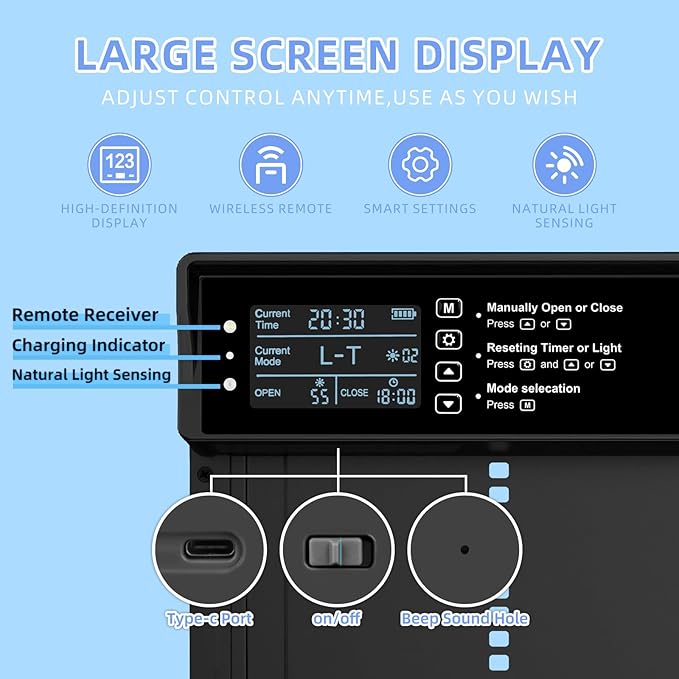 • TIMER & LIGHT SENSOR: The automatic chicken door is equipped with a timer and natural light sensing technology, which allows it to open and close automatically based on set times or prevailing light conditions. Our auto chicken coop door frees up your time for outings and breaks