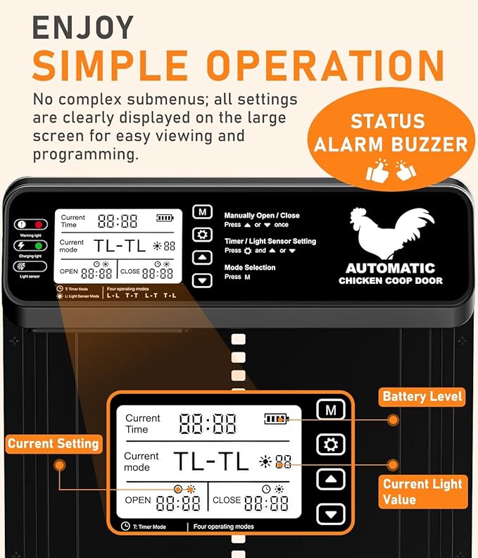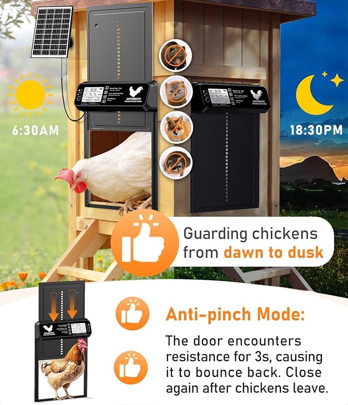 • 【Light Sensor Mode】The solar-powered door's adjustable light sensor, controlled via display, opens and closes based on light conditions. This supports chickens' biorhythm, improves health, and boosts egg production.