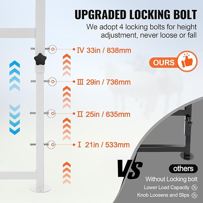 • 3. **βœ” 🌻 Adjustable Lamb Stand for Hoof Trimming**: Our lamb stand offers flexibility with a unique pin and knob design for height adjustments (21", 25", 29", 33"). It ensures stability with a reliable pin-lock system and reinforced tabletop welding.