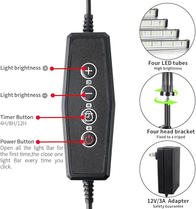 • 【Easy to Install】 you can easily put the 4-head lamp into the bracket and turn the screw to fix it. Then adjust the height according to your needs. The bracket is made of steel and aluminum, which is VERY strong and dissipates heat VERY quickly.